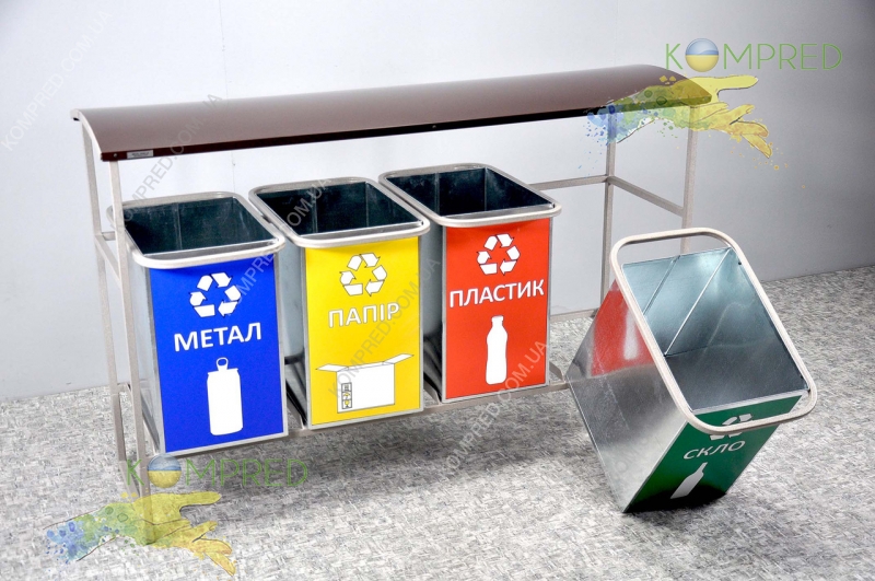 - Обклеювання кольоровою плівкою з назвами фракцій (папір, пластик, скло, змішані) — забезпечує правильне сортування