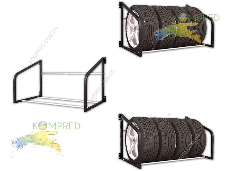 Відкидна полиця для організації зберігання шин та колес в гаражі, регулюється по ширині від 1000 мм до 1500 мм. Каркас з металу з порошковим покриттям. Фарбування в будь-який колір по RAL за бажанням замовника.