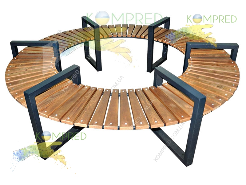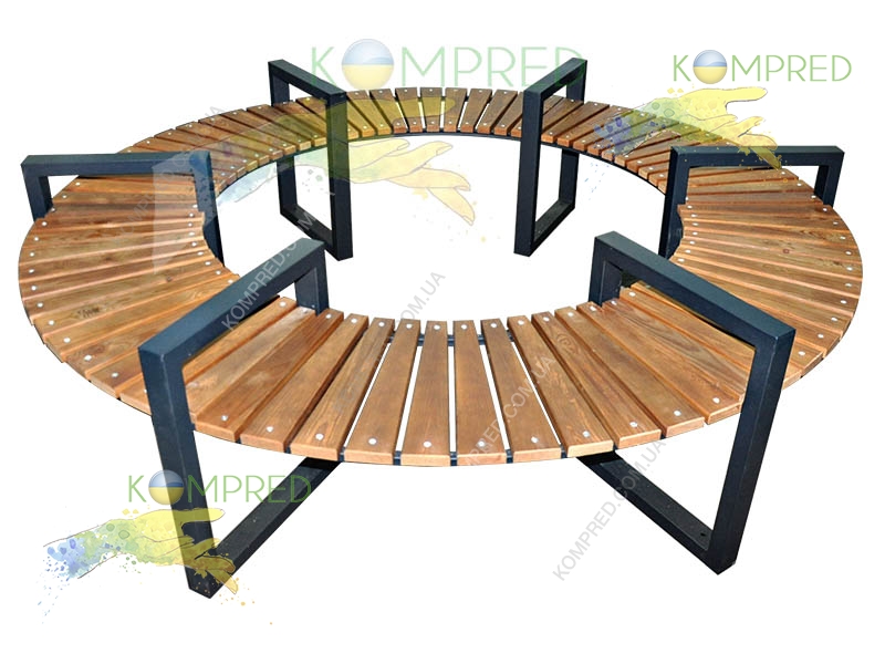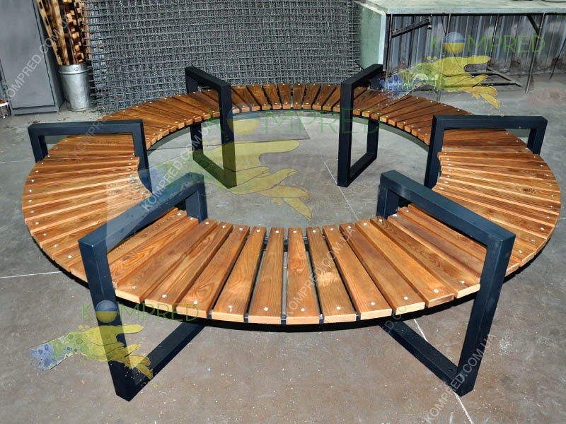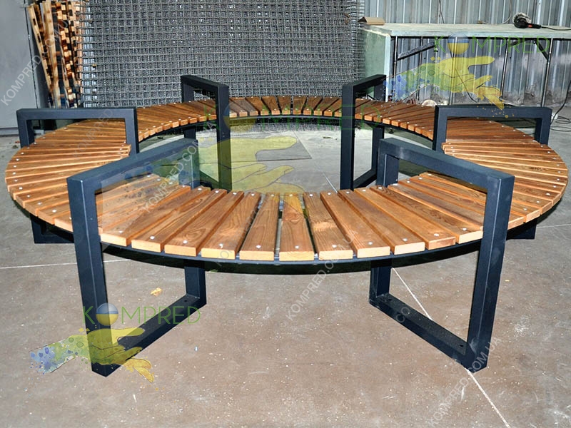 Кругла металева лавка з дерев’яним настилом – це стильне та функціональне рішення для благоустрою парків, скверів, дворів і приватних садів. Завдяки оригінальній формі лавка гармонійно вписується в сучасний і класичний ландшафтний дизайн, створюючи комфортну зону відпочинку навколо дерев, клумб або декоративних елементів.
