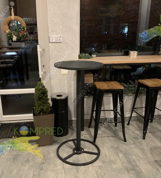 Вуличний стіл призначений для використання в бістро, кафетеріях швидкого харчування, барах. Конструкція столика суцільнозварна. При необхідності є можливість виготовлення розбірної конструкції. Стільниця — лист сталевий 3 мм. За таким столиком зручно швидко випити чашечку кави, можна обладнати барним стільцем.