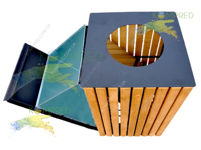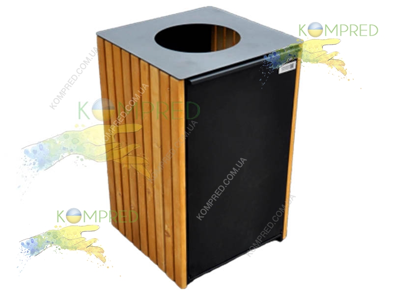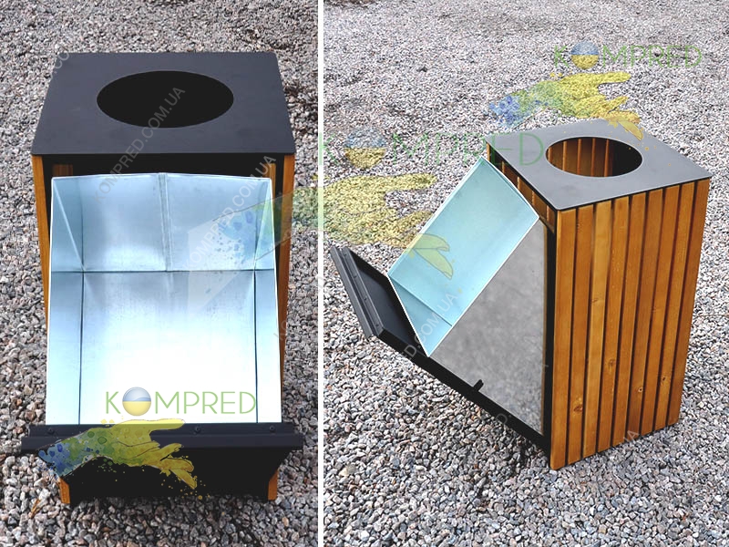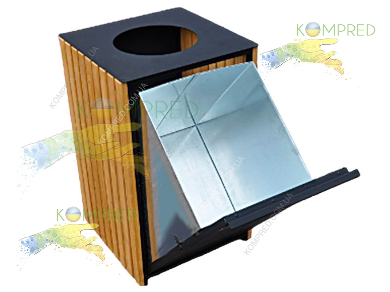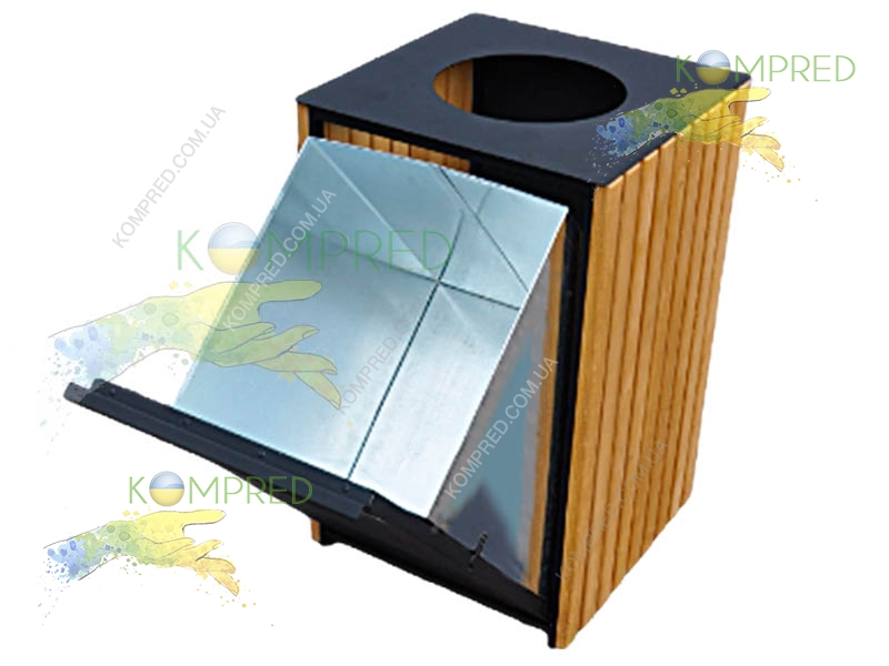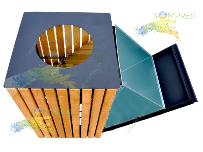 Конструкція урни суцільнозварна збірно-розбірна. Виїмка внутрішнього бака об'ємом 60 літрів з урни здійснюється нахилом поворотного механізму. Збір сміття відбувається в сміттєвий бак з оцинкованої сталі закріплений в відкидному механізмі. Решетування урни виконана дерев'яним брусом пофарбованим спеціальним просоченням по дереву. Урна стоїть на пластикових заглушках. Каркас урни виготовлений із сталевого профільної труби різного перерізу. Покриття урни — полімерна порошкова фарба. Кольорове рішення по заявці. Обсяг урни 100 літрів.